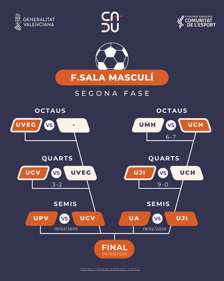 Todo el camino recorrido desembocará en la Jornada Final del 4 de marzo de 2026, que este año tendrá como sede principal la ciudad de Castellón. La Universitat Jaume I (UJI) ejercerá de anfitriona para decidir quiénes son los campeones universitarios de la Comunitat Valenciana.