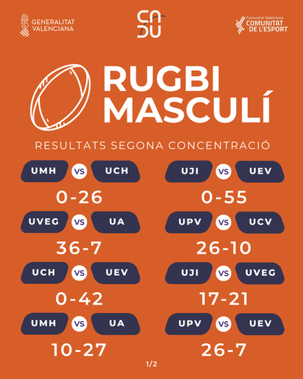 En la modalidad de rugby, se mantiene el sistema de concentración de la competición, un formato que permite disputar múltiples encuentros en un solo día. Cada universidad disputó un total de tres partidos durante la mañana y una vez finalizados, los equipos ya estan a la espera de la tercera y última jornada de concentración previa a los play-offs. Esta última jornada se disputará en tierras alicantinas el 4 de febrero de 2026.