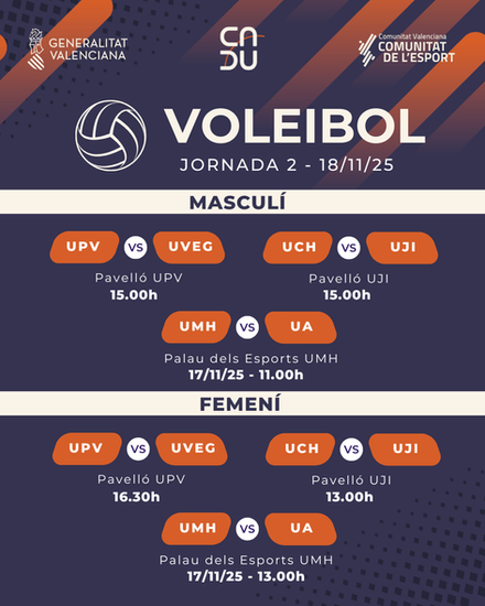 La mayoría de los encuentros se disputarán el martes 18 de noviembre de 2025, pero la acción se adelantará al dia 17 de noviembre con las disputa de los enfrentamientos entre la UMH y la UA. Por su parte los partidos de baloncesto entre la UVEG y la UPV se trasladan al dia 20 de noviembre.